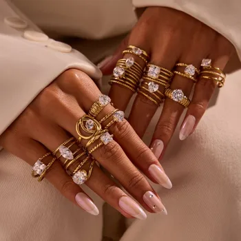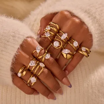 2024 New Style Metal Gold Color Large Thick Geometric Square Open Cuff Armband Bracelet Ring Set for Women Jewelry