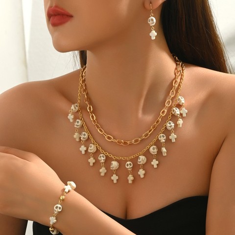 โบฮีเมียนทำด้วยมือชุดสร้อยข้อมือสร้อยคอตุ้มหูหัวกะโหลกสีขาวเทอร์ควอยซ์แบบไม่สม่ำเสมอ
