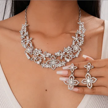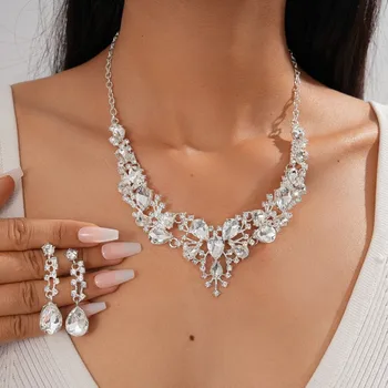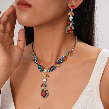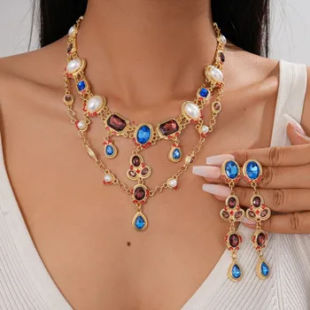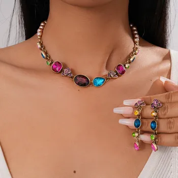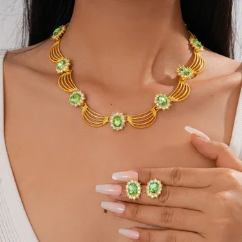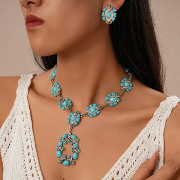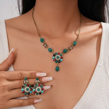 Sang trọng phong cách dân tộc kim cương dát nhựa rỗng hình bầu dục Mặt dây chuyền vòng cổ bông tai đặt cho phụ nữ bên phụ kiện
