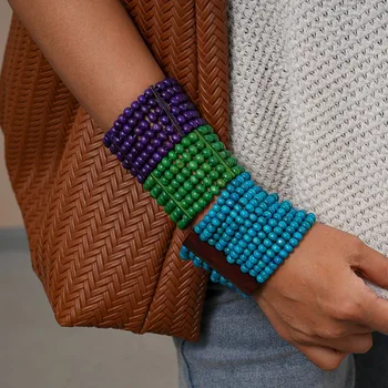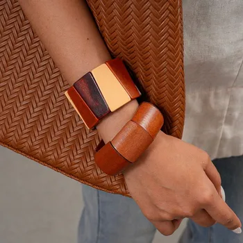 Phóng đại hạt gỗ hình học nhiều lớp Vòng đeo tay rộng Bangles đối với phụ nữ quà tặng đồ trang sức